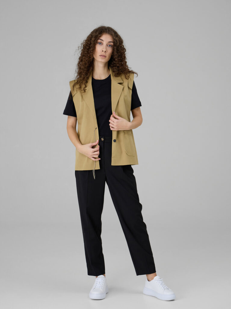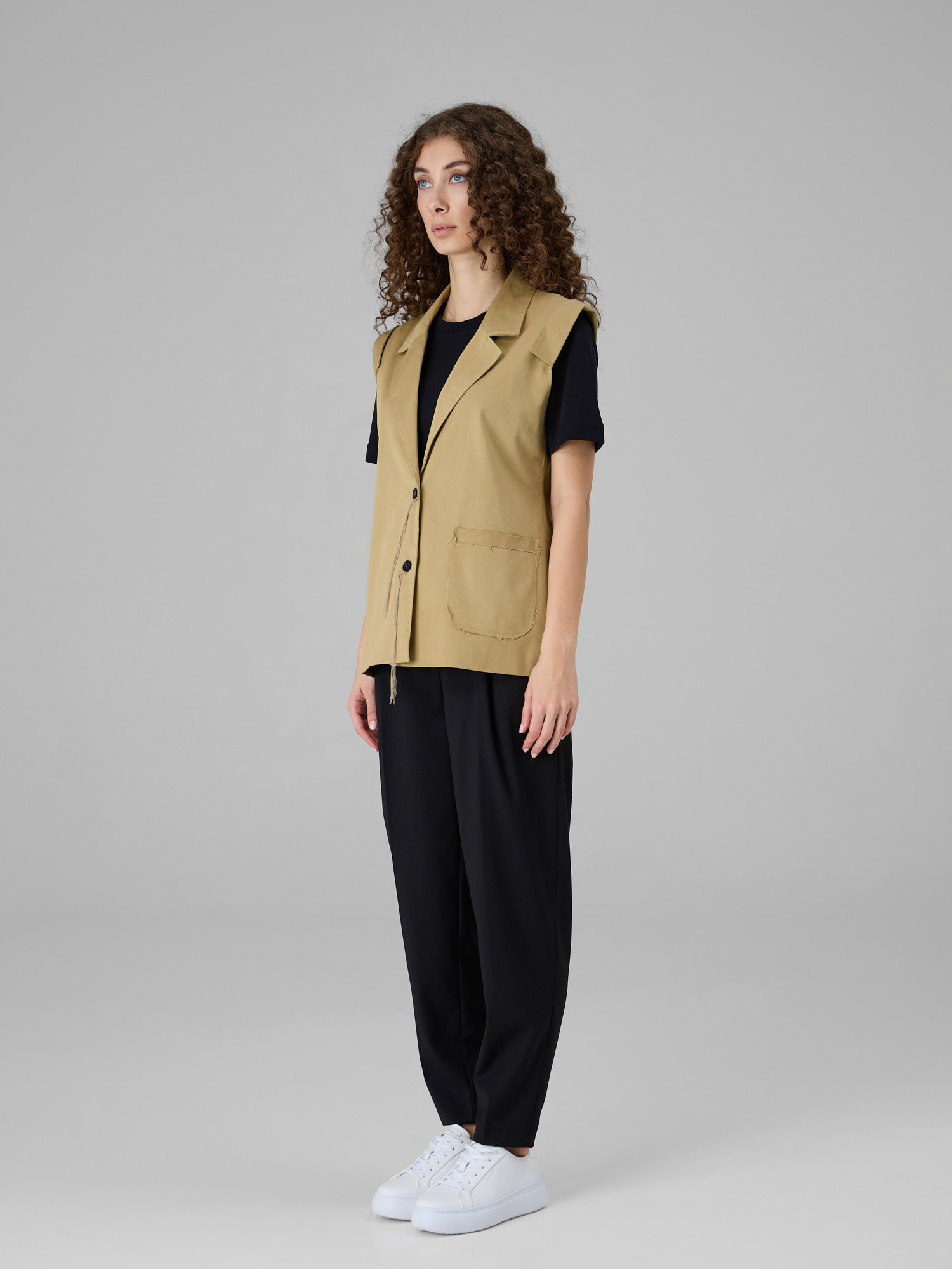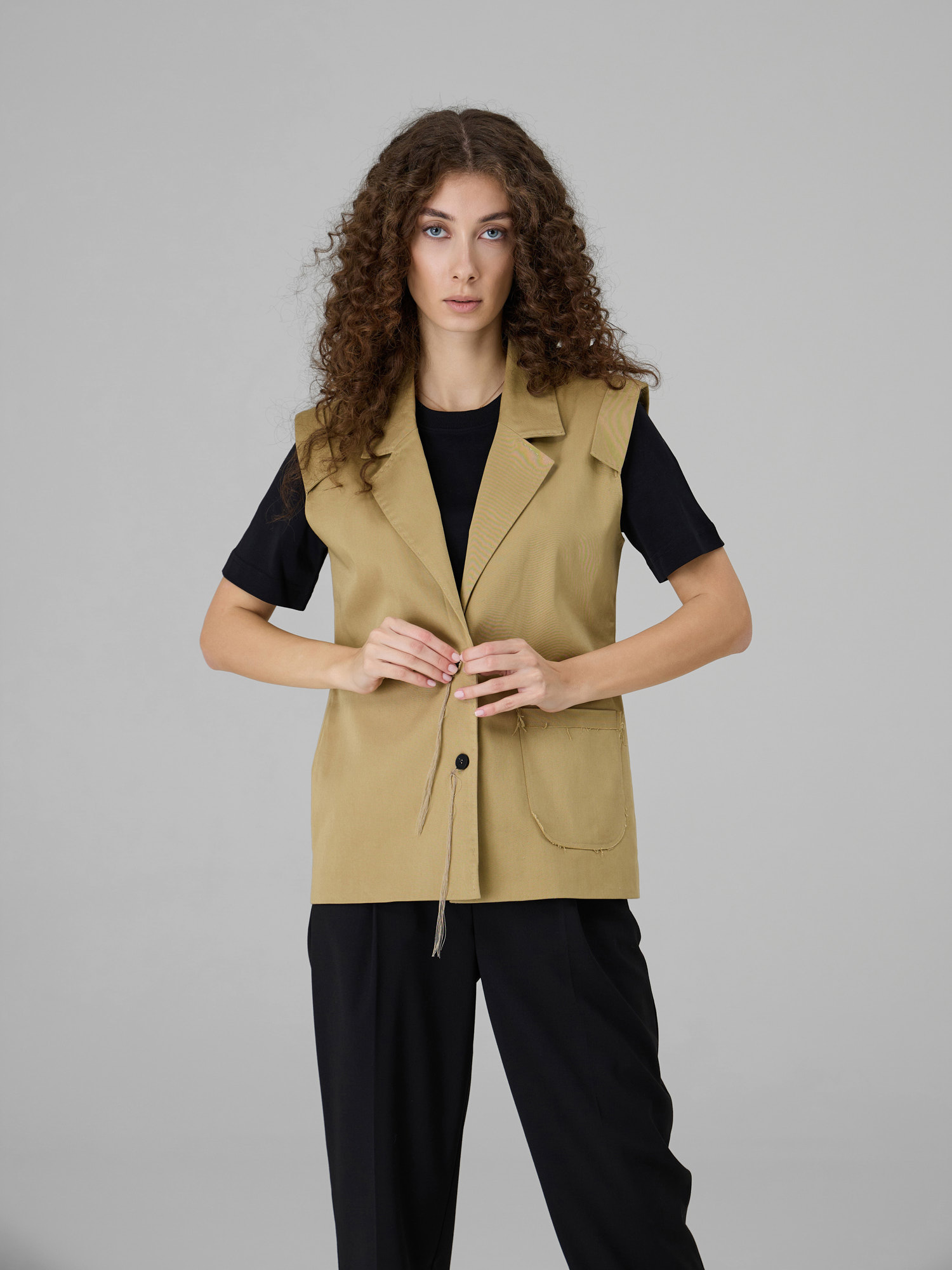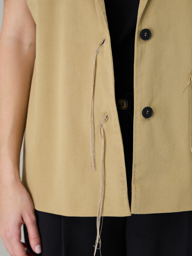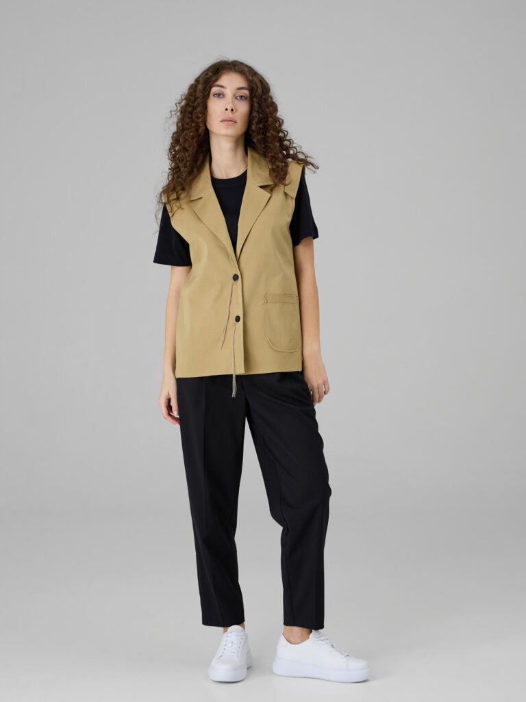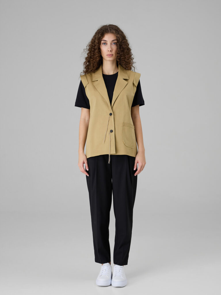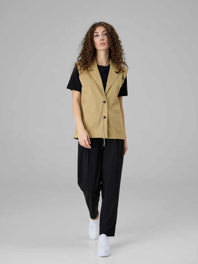 LOEN este o vesta cu umeri intorsi, definita de o croiala moderna si o estetica urbana, relaxata. Materialul usor si forma dreapta pastreaza minimalismul piesei, in timp ce detaliile neconventionale ii ofera caracter.