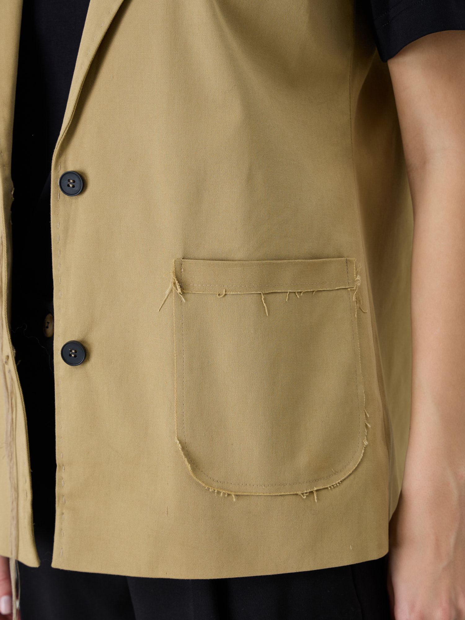 Buzunarele cusute pe dos si finisajele raw creeaza un contrast subtil intre structurat si nefinisat, accentuand expresivitatea designului. Reverul clasic si liniile curate asigura echilibrul vizual, iar umerii intorsi raman elementul central al piesei.