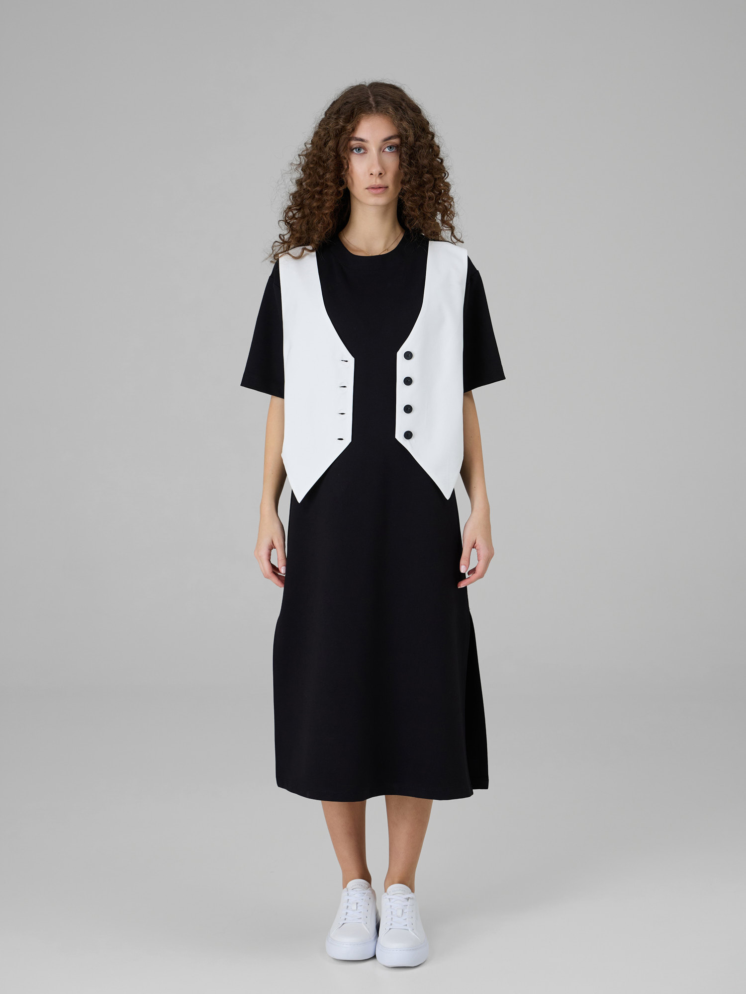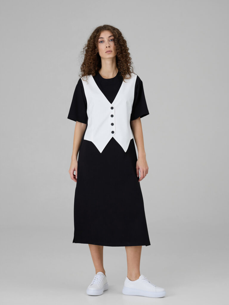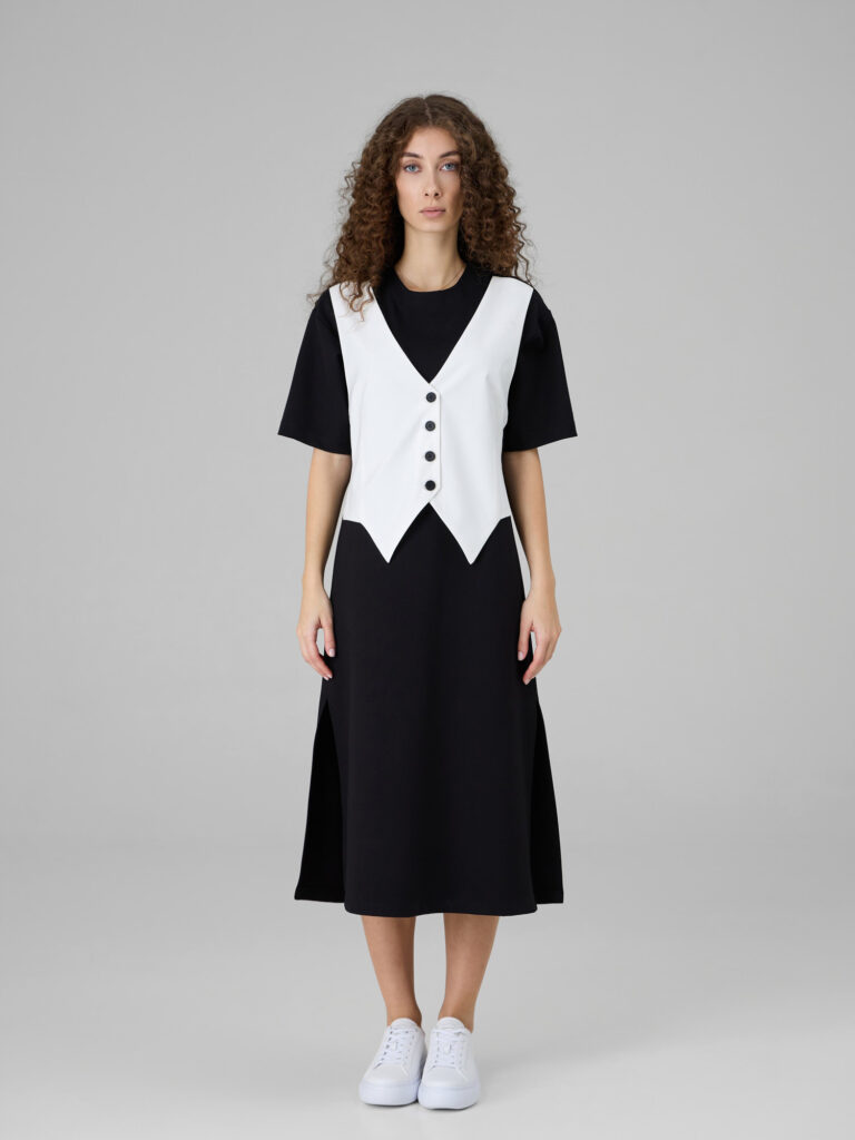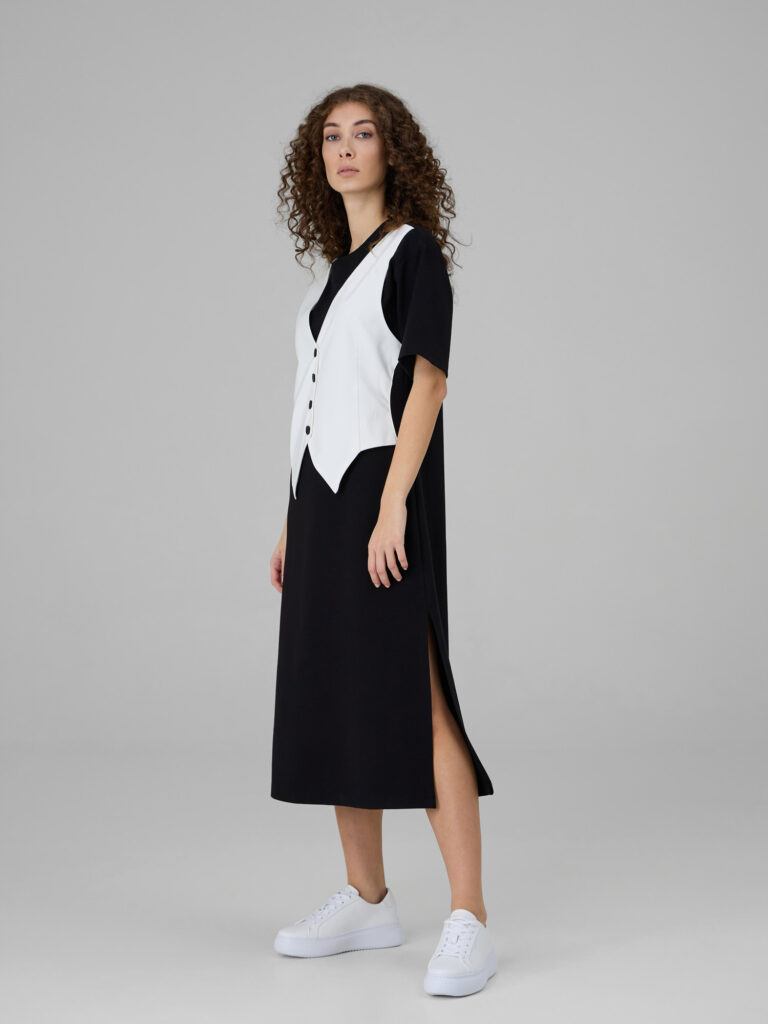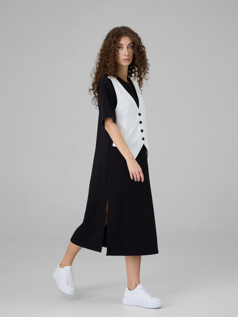 MAEN Dress este interpretarea moderna a rochiei urbane, cu un twist inspirat din croiul vestei clasice. Silueta lunga, fluida, este completata de partea frontala structurata, care adauga un contrast elegant si o linie grafica puternica. Rezultatul este o piesa statement, minimalista, dar cu impact vizual maxim.