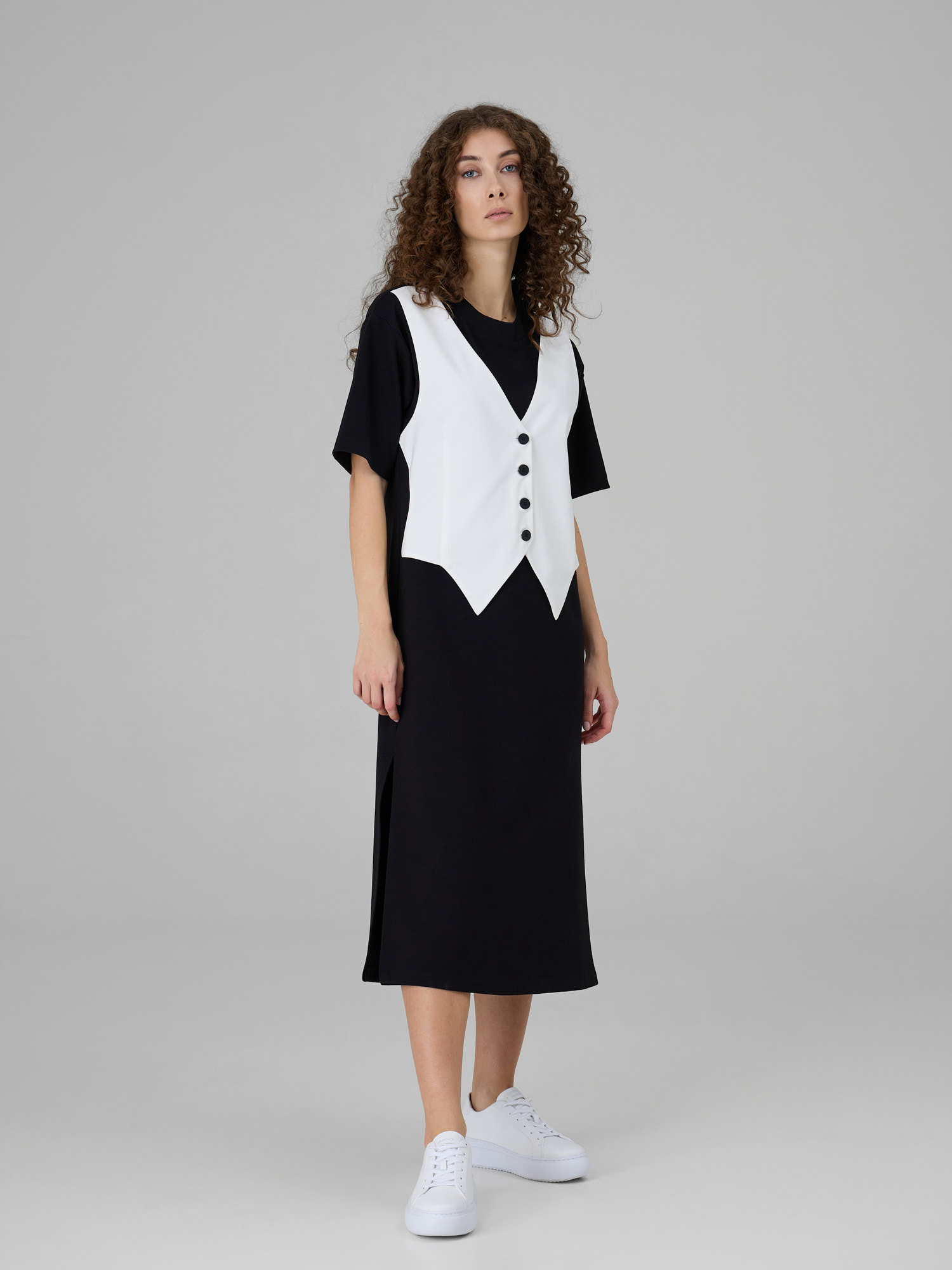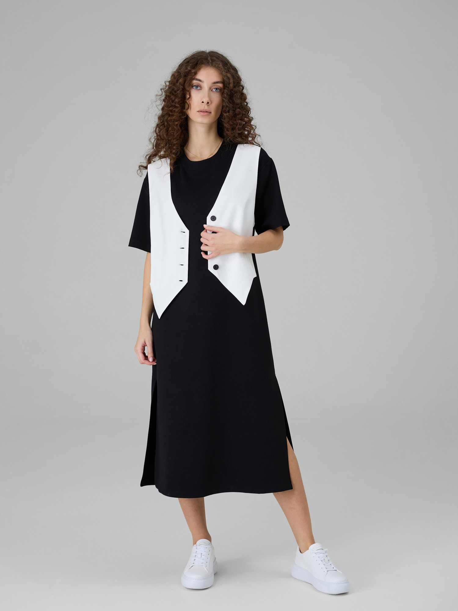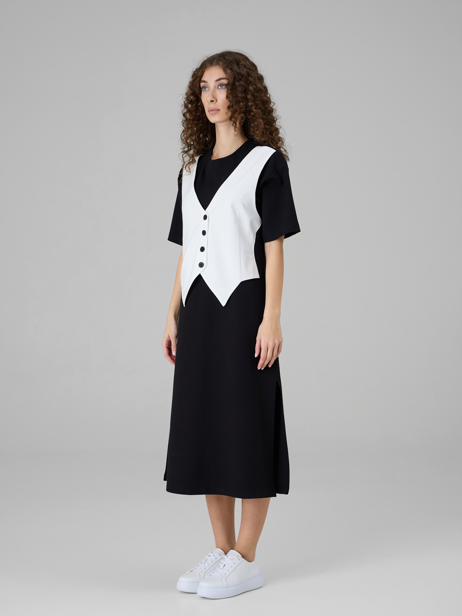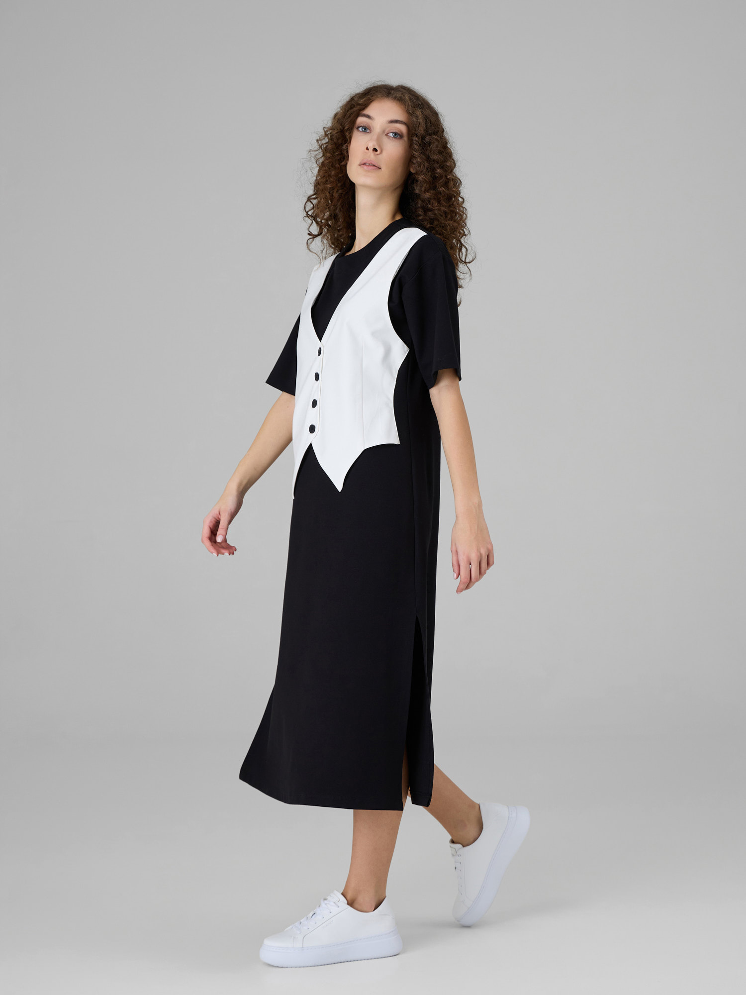 MAEN Dress este interpretarea moderna a rochiei urbane, cu un twist inspirat din croiul vestei clasice. Silueta lunga, fluida, este completata de partea frontala structurata, care adauga un contrast elegant si o linie grafica puternica. Rezultatul este o piesa statement, minimalista, dar cu impact vizual maxim.