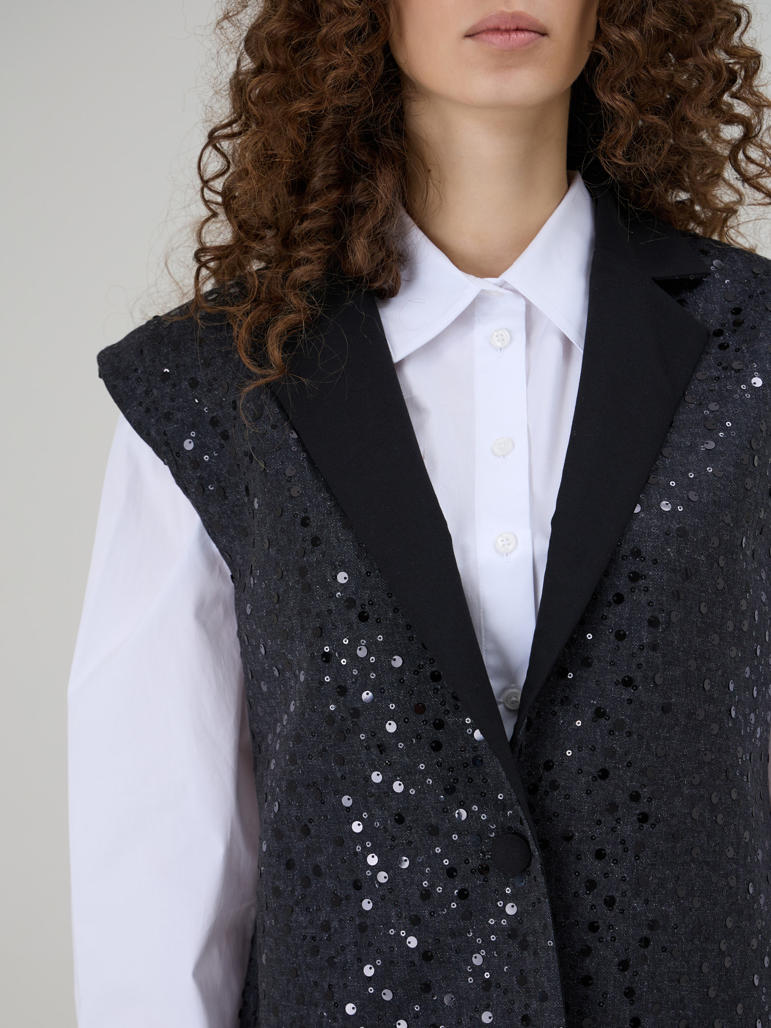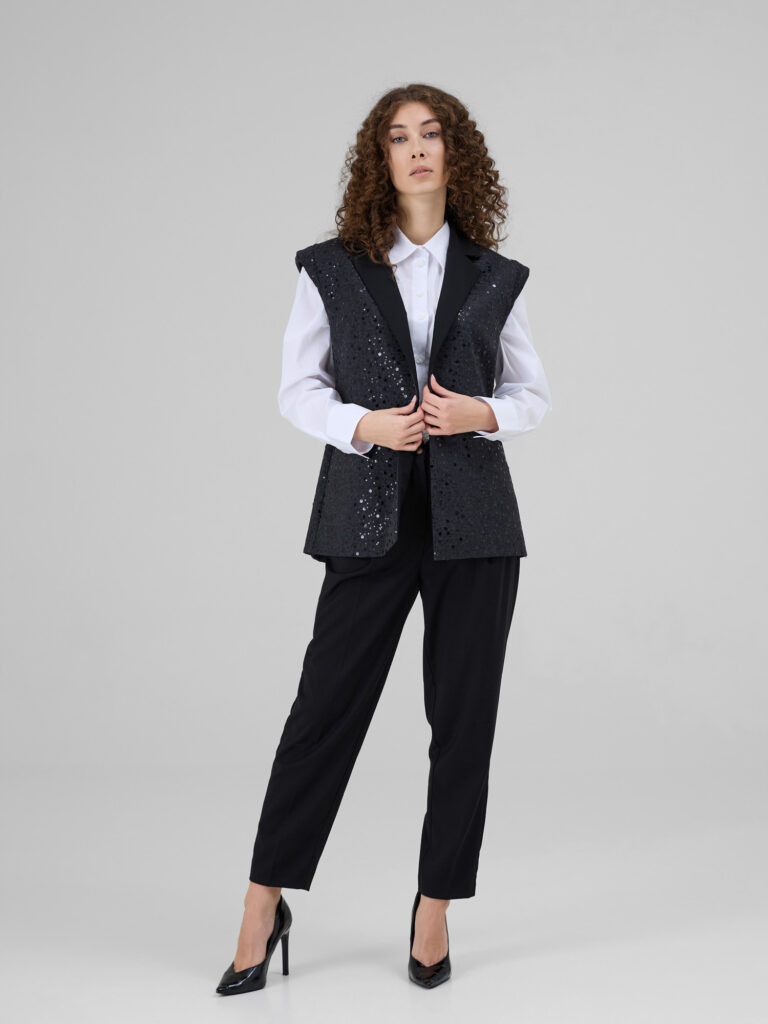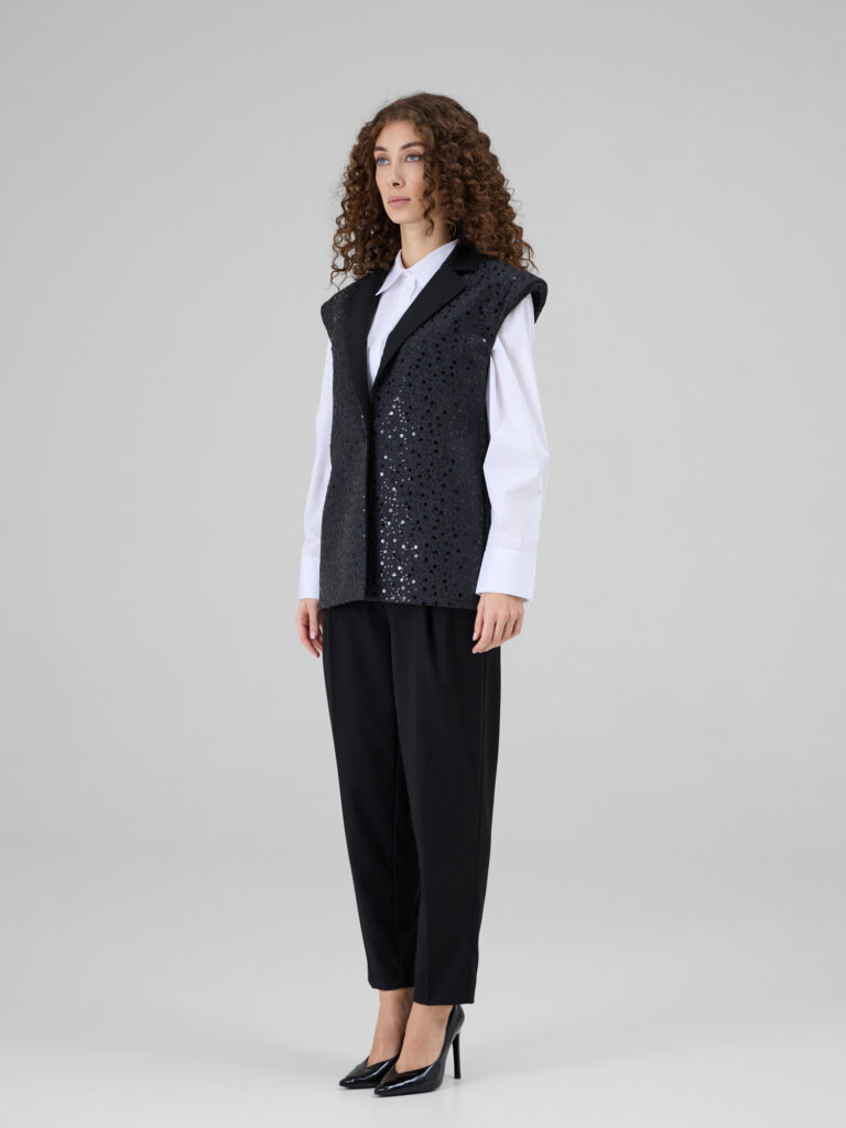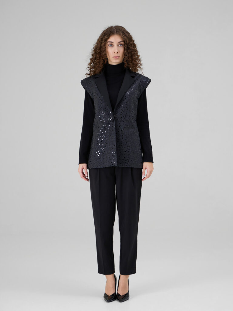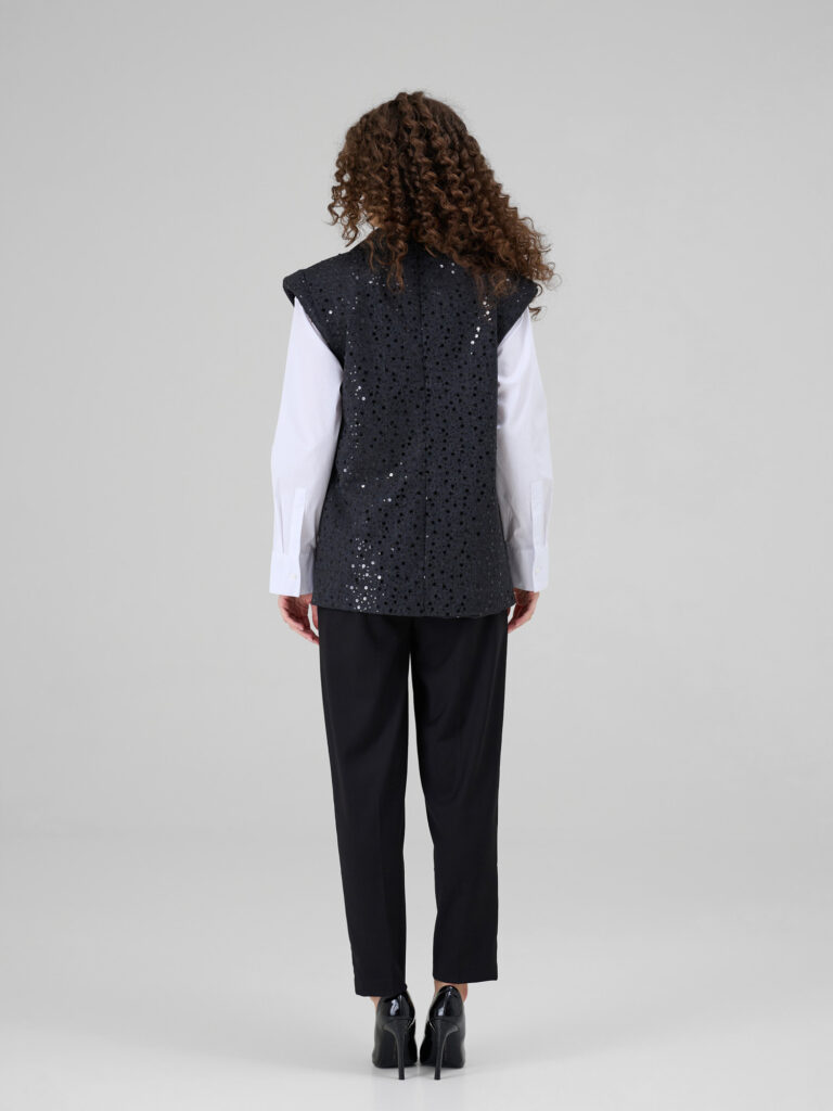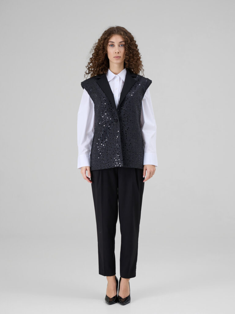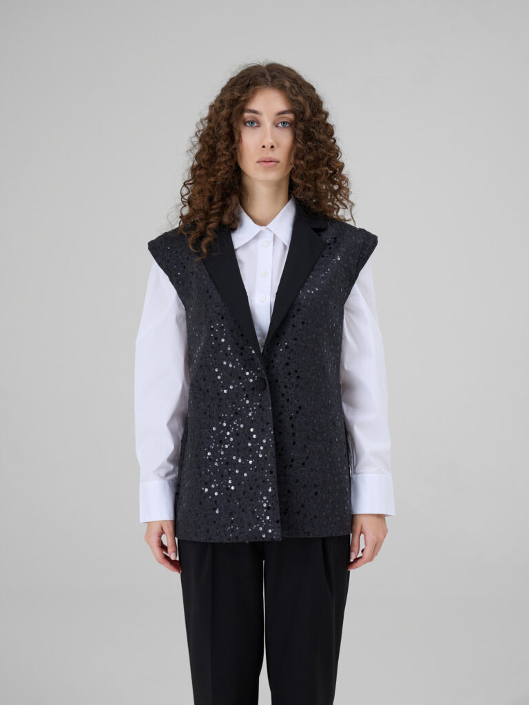 NOAR este o vesta cu linii curate si umeri proeminenti, care ofera structura si o silueta moderna. Realizata din denim sintetic, piesa este decorata cu insertii discrete de paiete ce adauga o textura subtila si un luciu controlat. Reverul din stofa completeaza designul si accentueaza arhitectura taieturii.