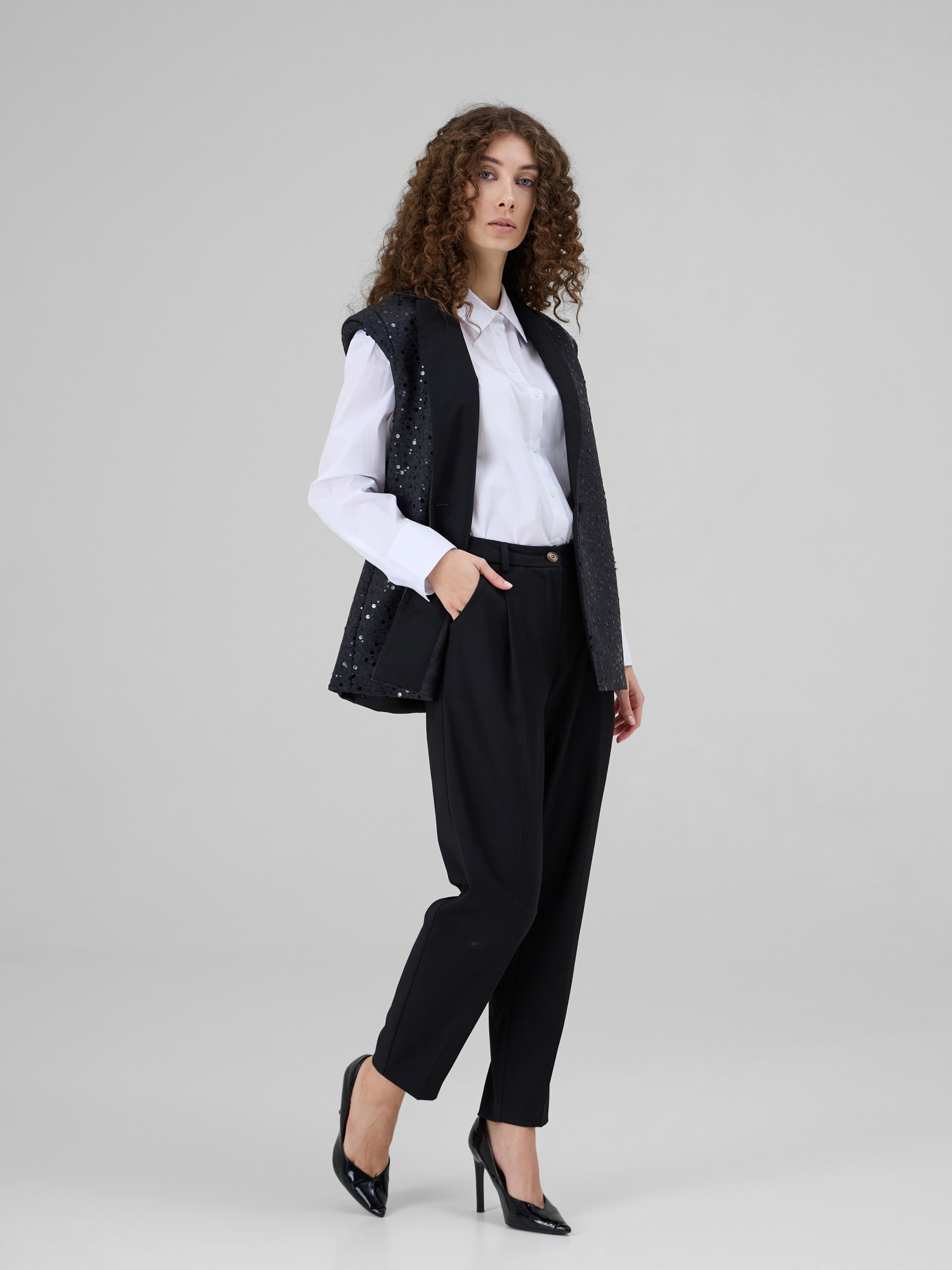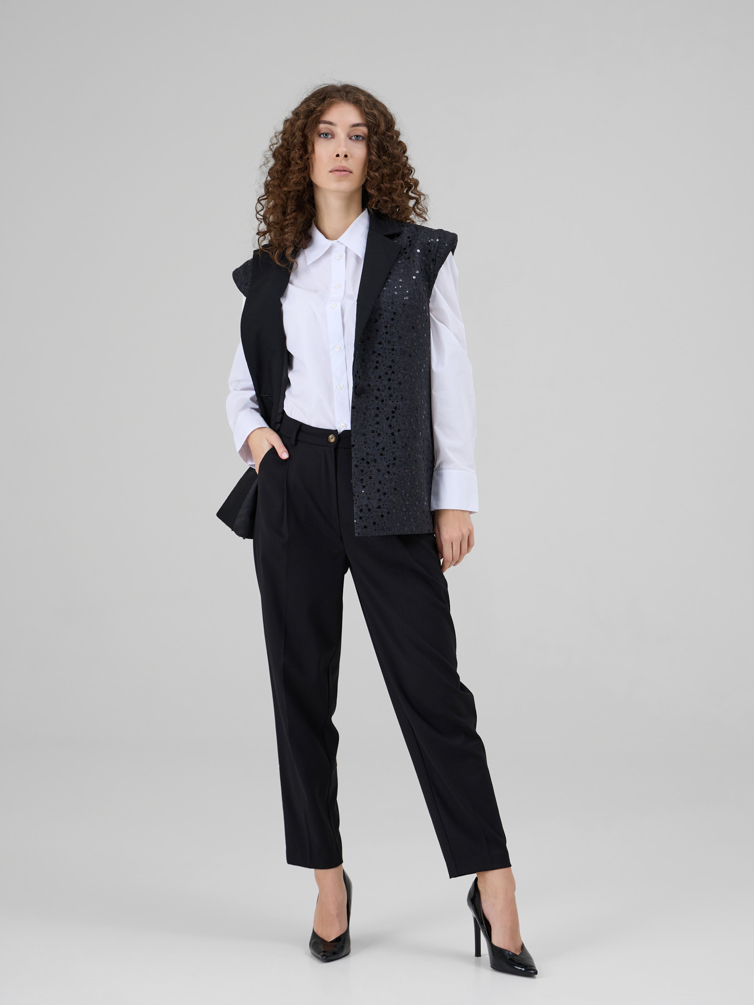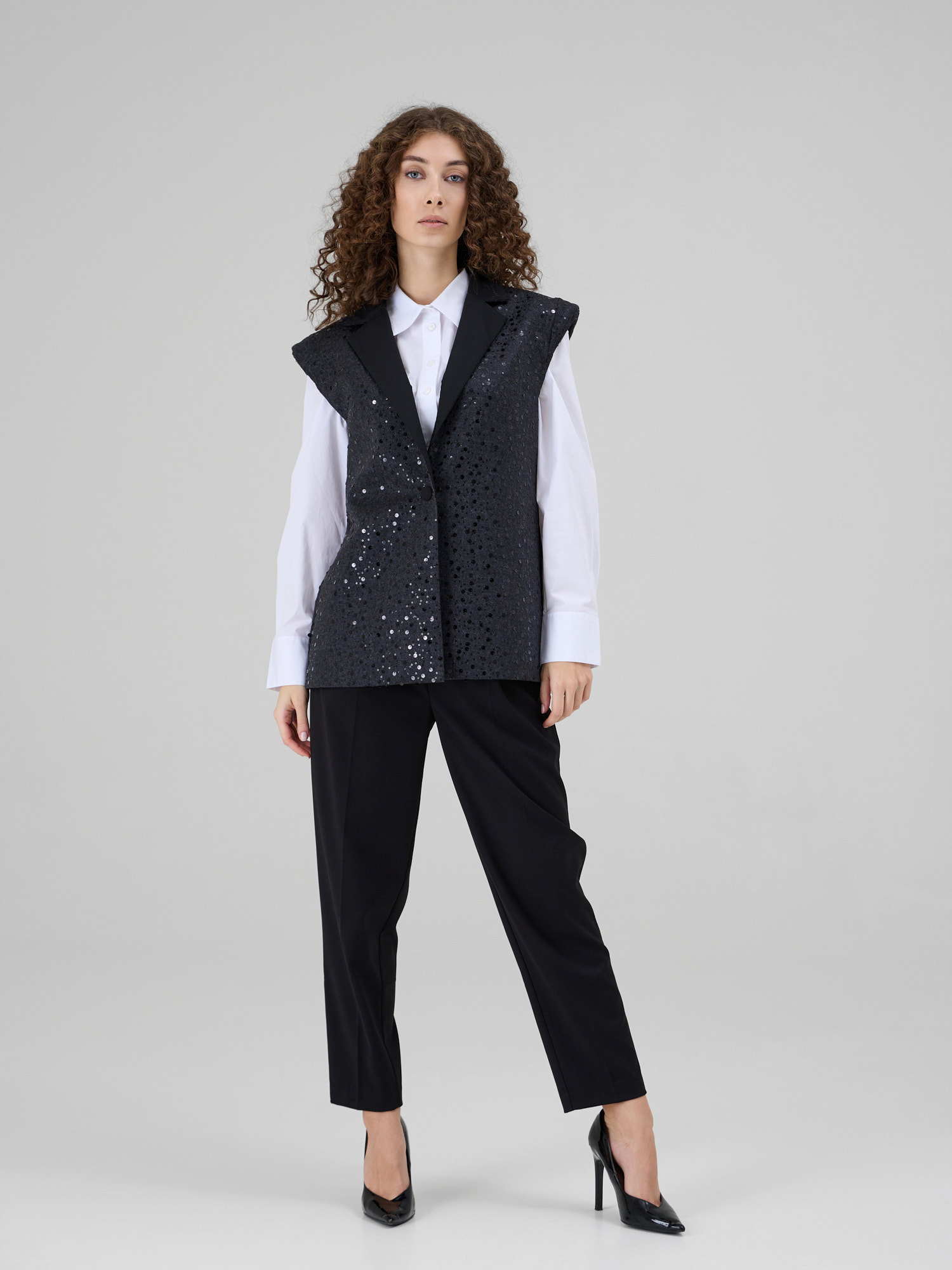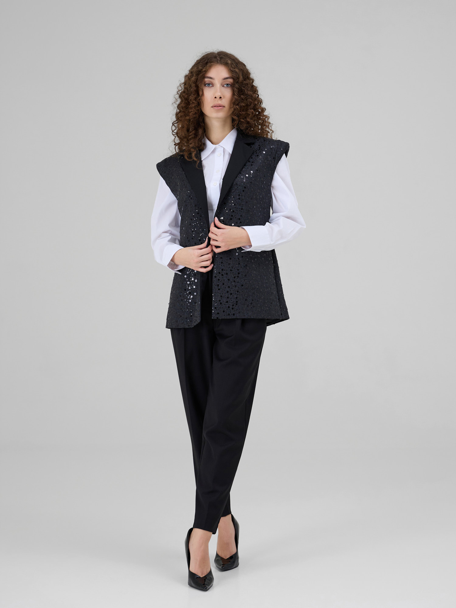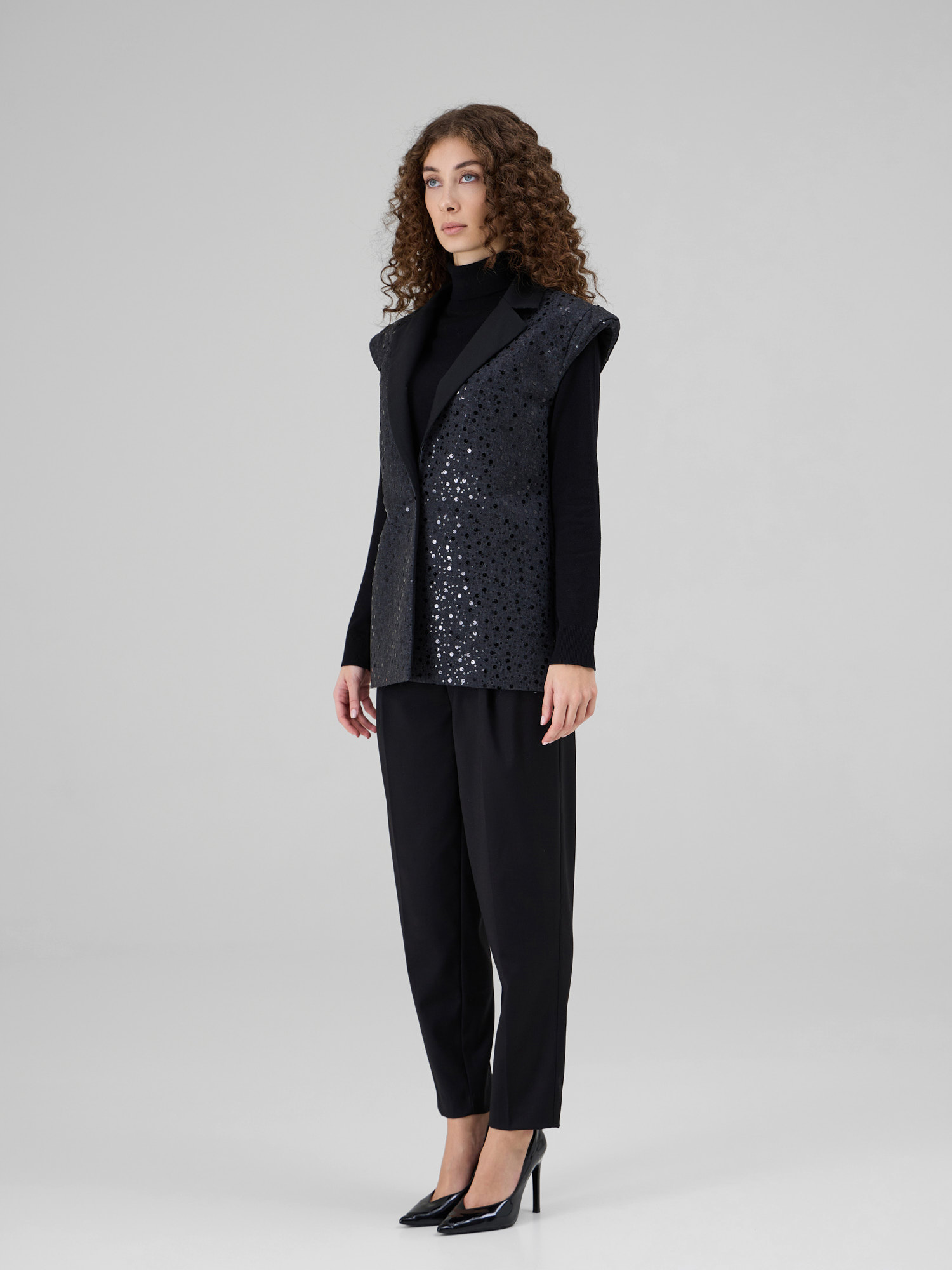 NOAR este o vesta cu linii curate si umeri proeminenti, care ofera structura si o silueta moderna. Realizata din denim sintetic, piesa este decorata cu insertii discrete de paiete ce adauga o textura subtila si un luciu controlat. Reverul din stofa completeaza designul si accentueaza arhitectura taieturii.