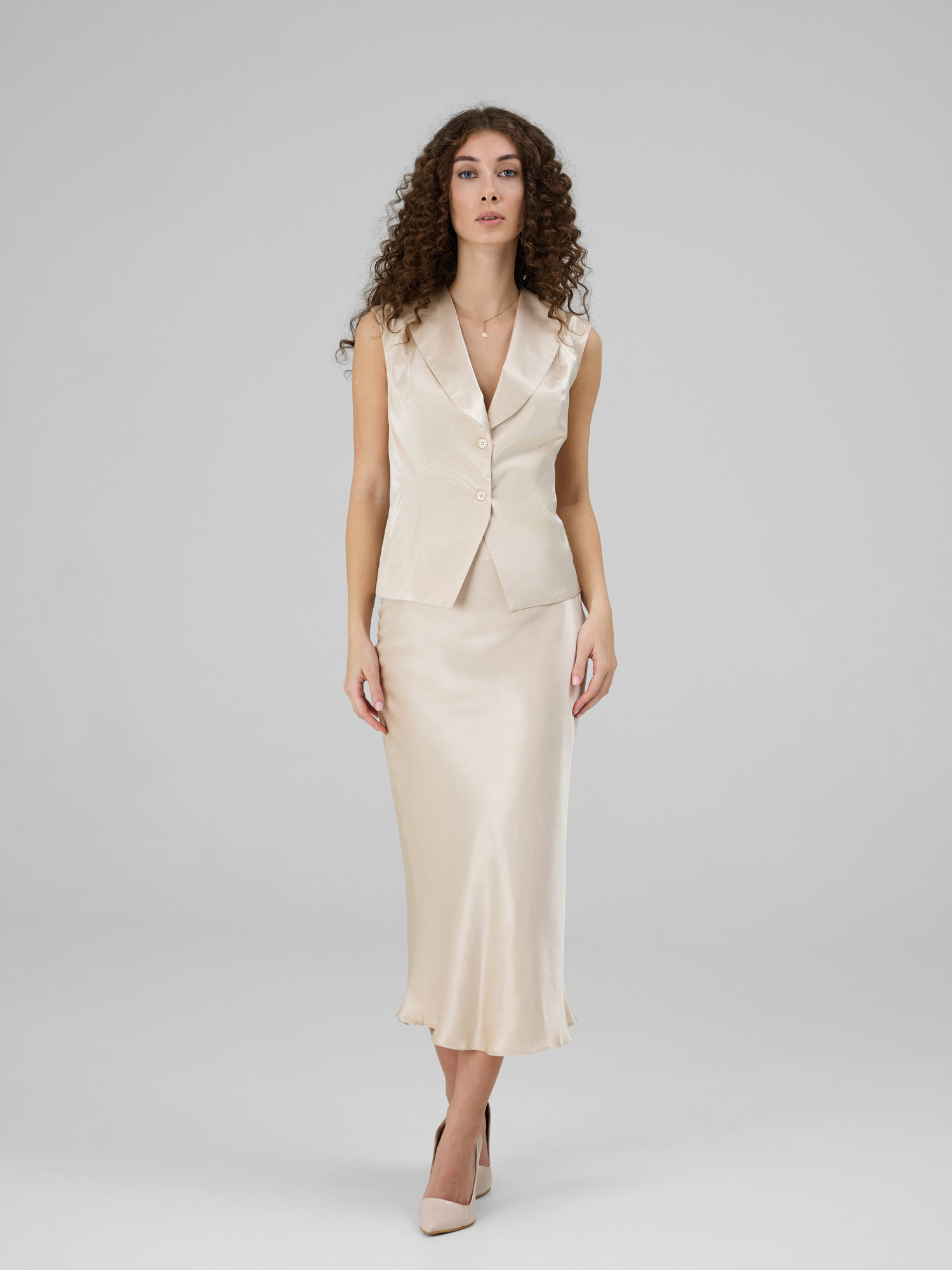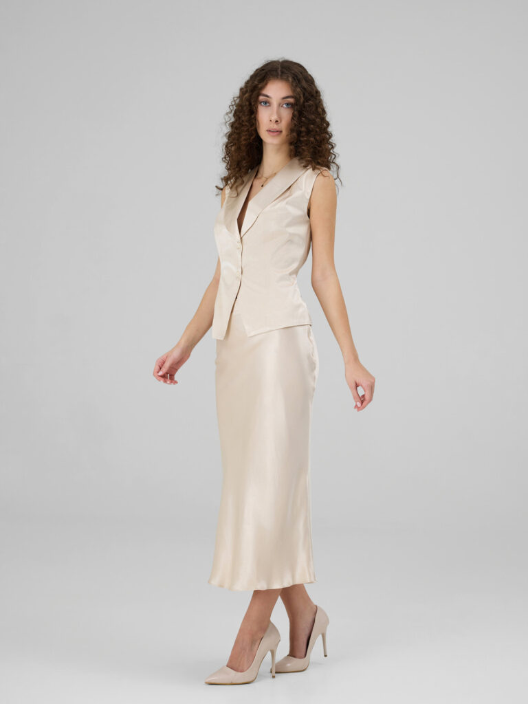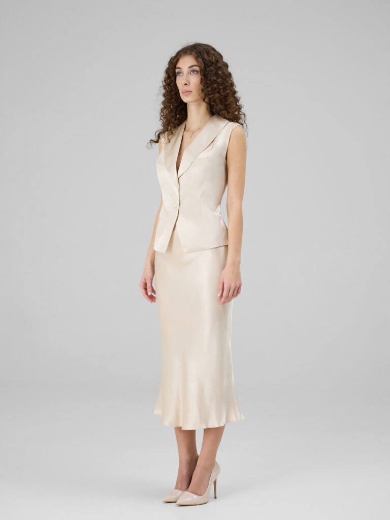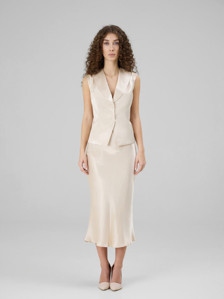 ELA este un set din satin cu textura fina si croi curat, creat pentru o silueta armonioasa. Vesta structurata contureaza frumos talia, iar fusta croita in bie, cade impecabil si urmareste miscarea corpului cu lejeritate si rafinament.
