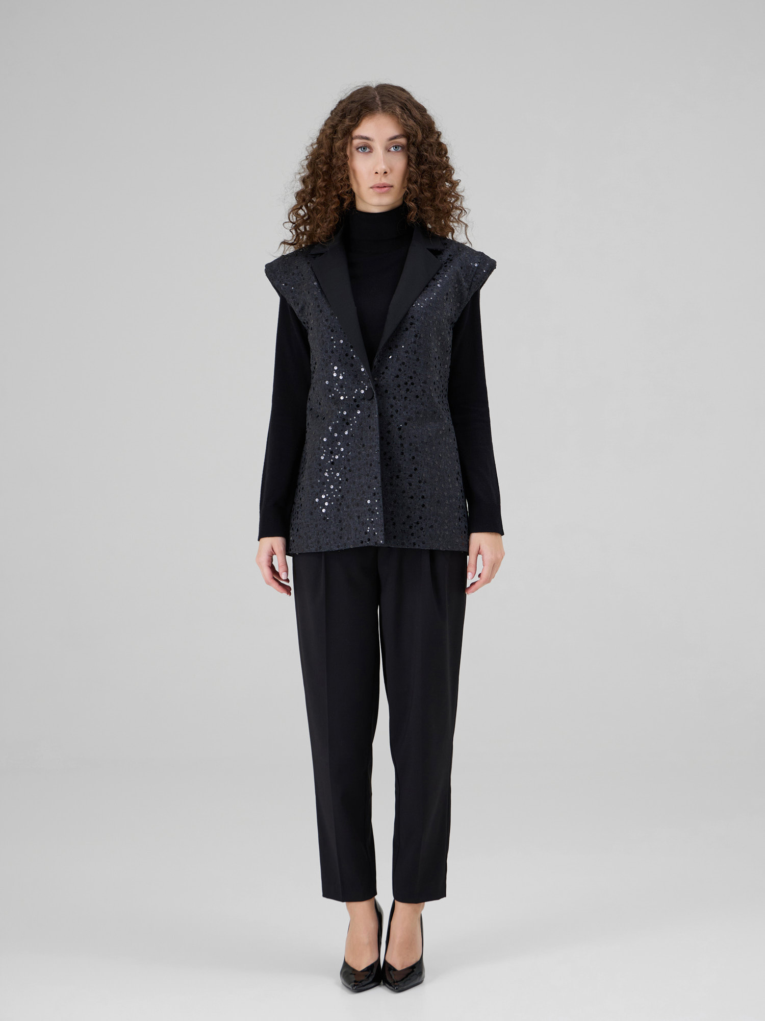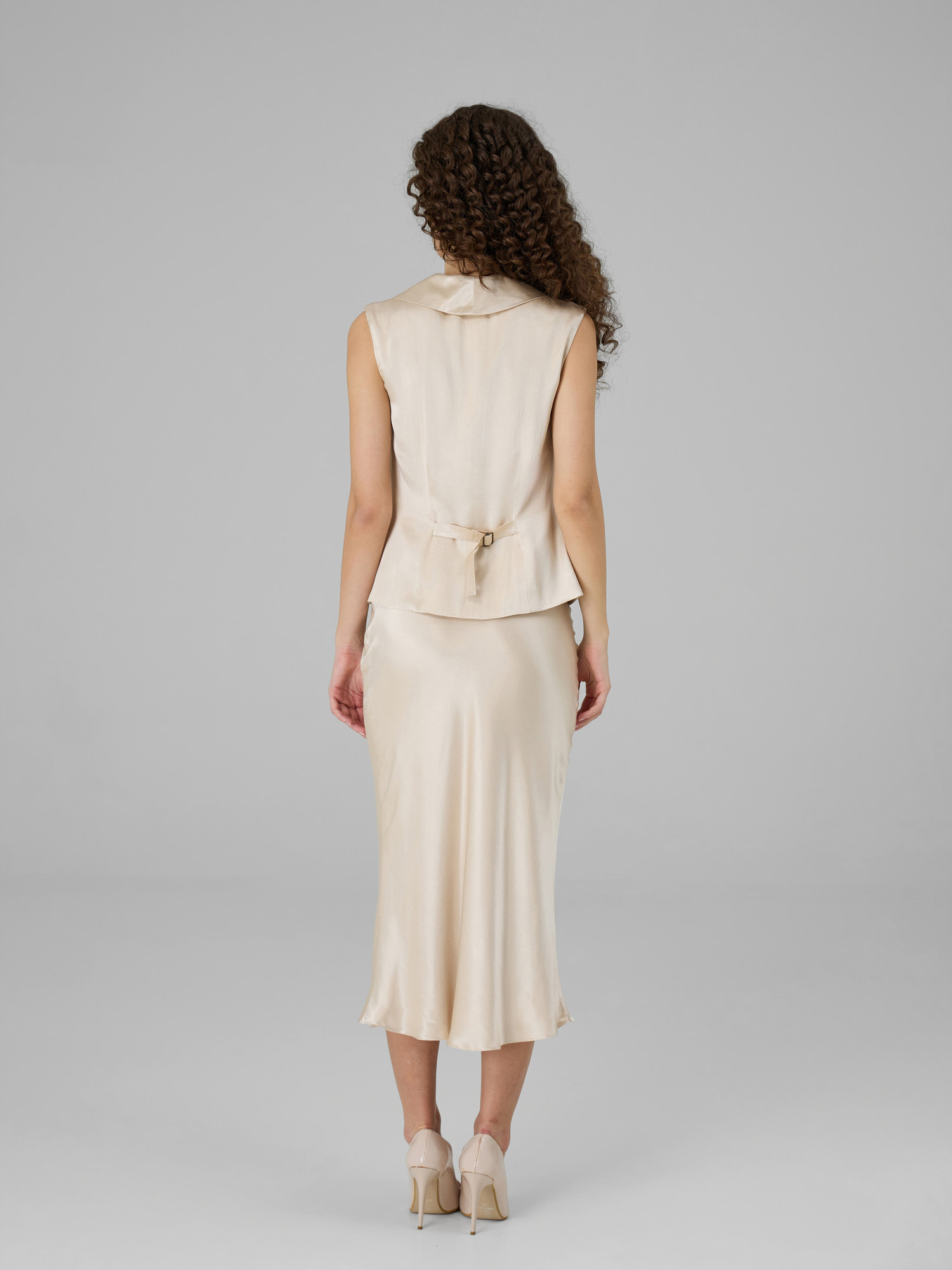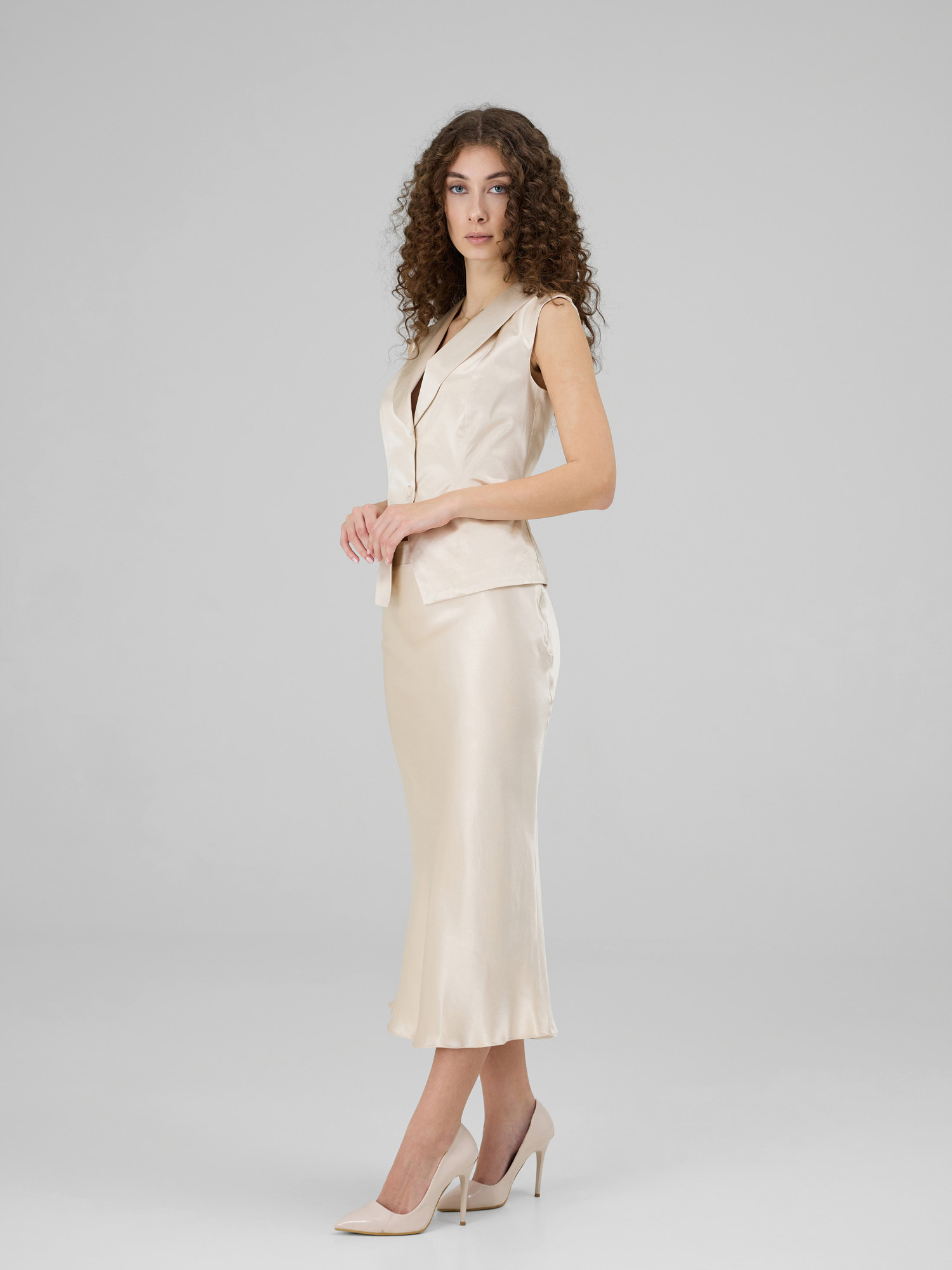 ELA este un set din satin cu textura fina si croi curat, creat pentru o silueta armonioasa. Vesta structurata contureaza frumos talia, iar fusta croita in bie, cade impecabil si urmareste miscarea corpului cu lejeritate si rafinament.